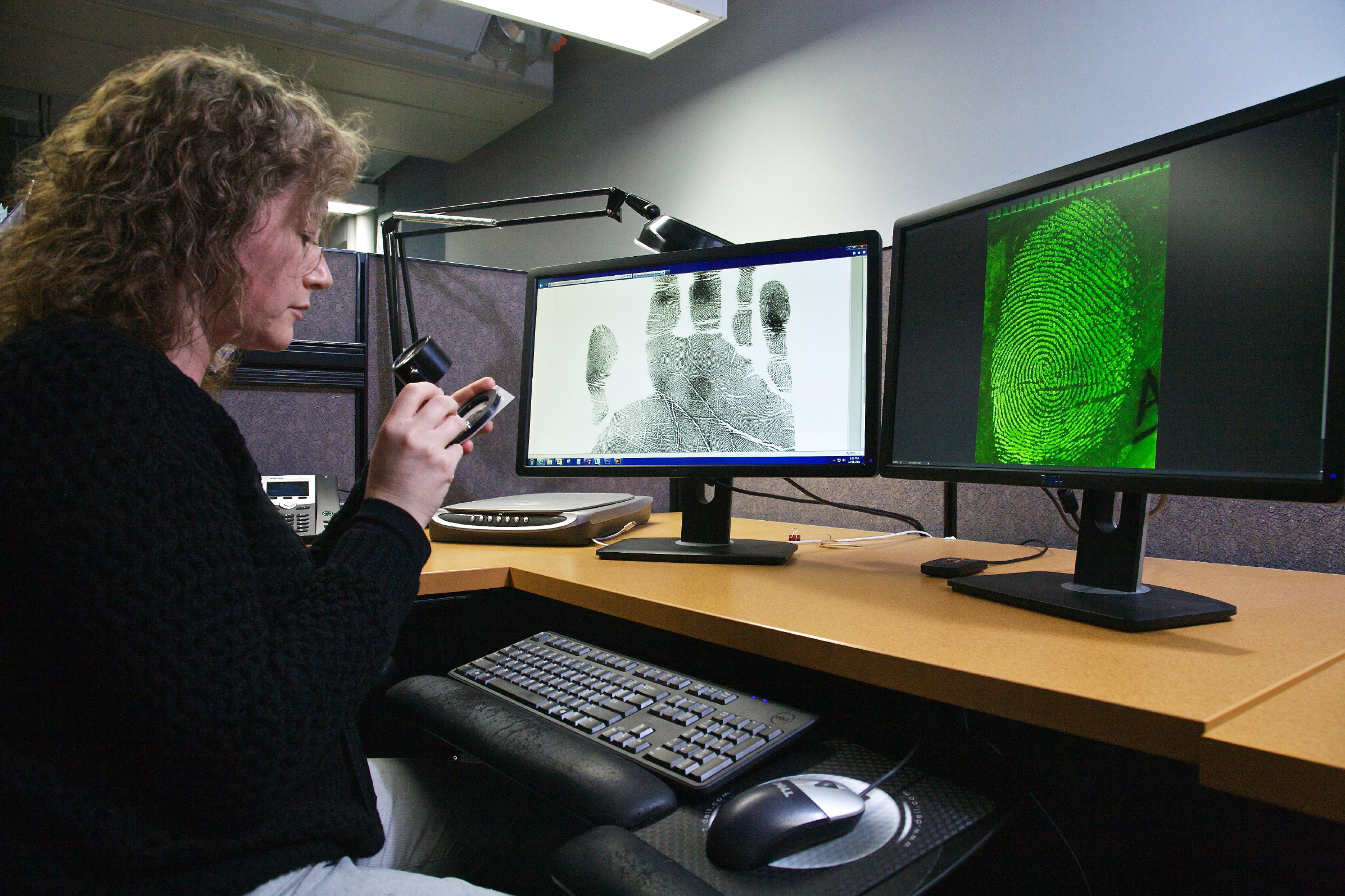 Above: Latent Print Examiner Kerie Cress compares recorded fingerprints and latent prints collected at a crime scene to resolve identification