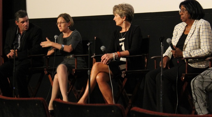 A panel discussion followed the screening of “Tough Love” at the Uptown. From left are Patrick Brown, Alena Ciecko, Judge Julia Garratt and Judge Patricia Clark. Photo by Leslie Brown.