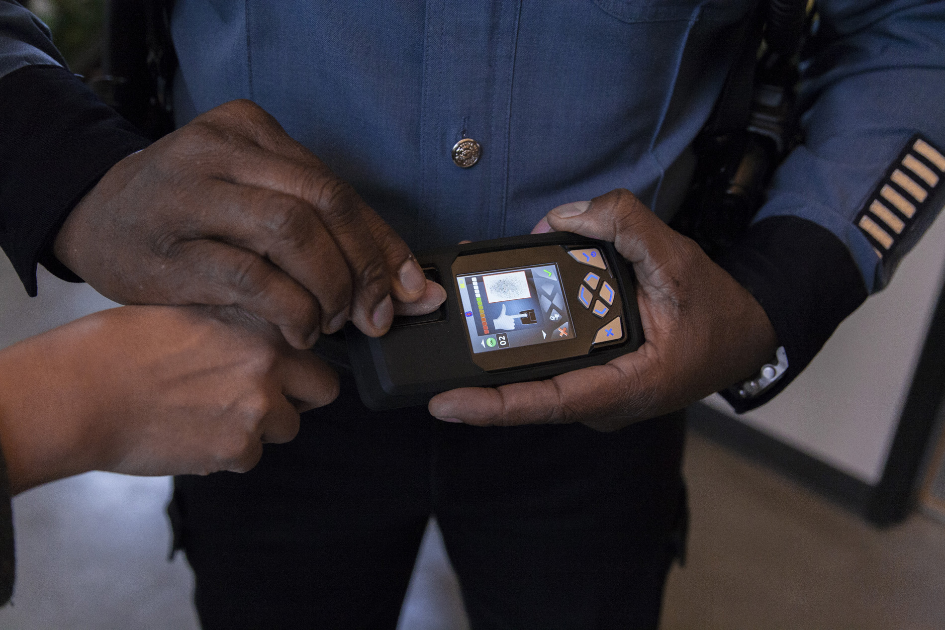Mobile ID is a handheld fingerprint device paired with software that gives the officer the ability to search two fingerprints against the Automated Fingerprint Identification System (AFIS) and receive results in minutes. Devices do not save data; fingerprints are searched against prints on file and are not stored in the database.