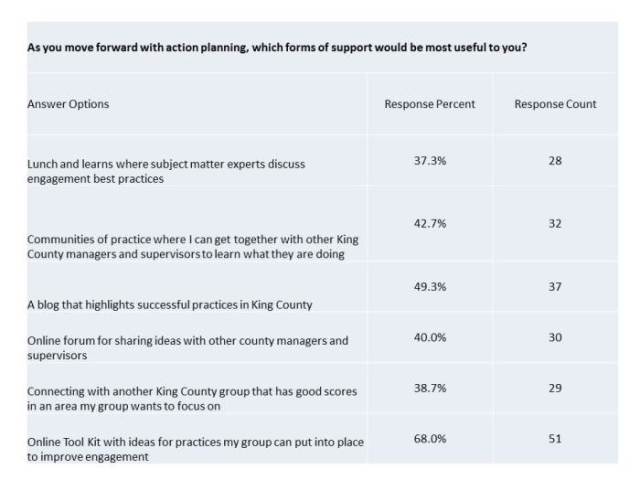 Last week we wrapped up trainings preparing managers and supervisors to lead their groups in responding to survey results. 498 (let’s call it 500) managers and supervisors participated in this training and still more are taking it online. That’s an incredible grassroots force out there leading culture change by having conversations with their work groups about how to improve engagement in the county.