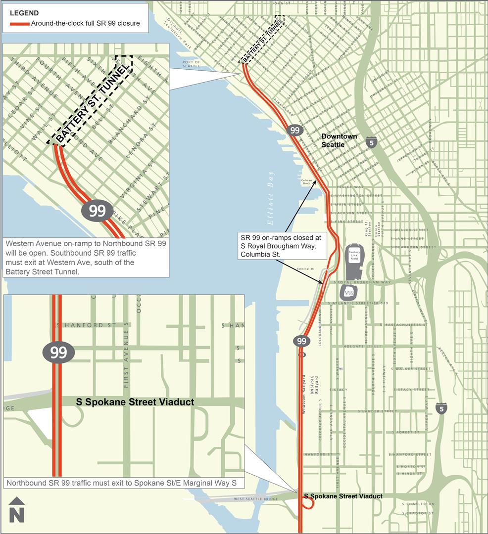 In a departure from other shutdowns, drivers entering downtown from the north will be allowed through the Battery Street Tunnel southbound to take the little-used Western Avenue offramp. Nearby, the northbound onramp at Western Avenue will be open and without any risk from converging viaduct traffic.