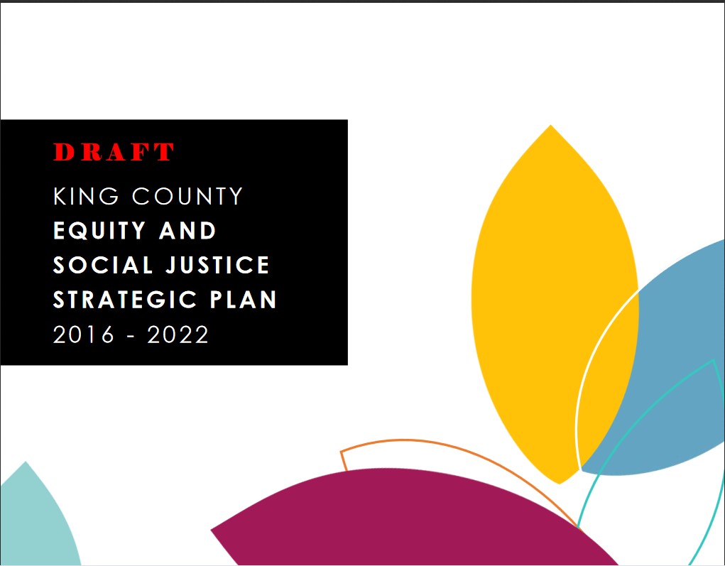 We are proud to share with you our draft King County Equity and Social Justice Strategic Plan, 2016-2022. This plan, our first for Equity and Social Justice (ESJ), builds on the good work that we have been doing in ESJ and pushes us to become even more thoughtful, strategic and effective. This Plan also lays out the values that we have co-created with employees and community partners and addresses the need to be inclusive, collaborative, responsive, adaptive and people-focused. Fundamentally, we are moving towards becoming a racially just organization.