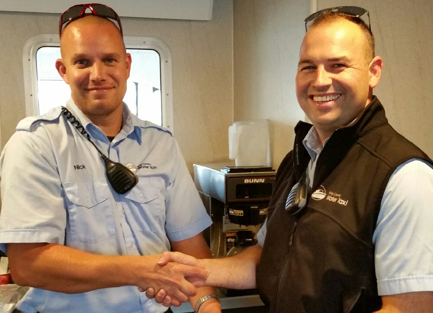 Pictured: Nick Williams, on the left, receiving Captains epaulets from Deckhand/Relief Captain GW Rogers.