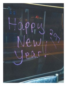 “The first day I did it, I wrote ‘Happy January’ facing the inside of the bus, and ‘Feliz Enero,’ written backwards, facing outside for the people in the cars to see,” she said.