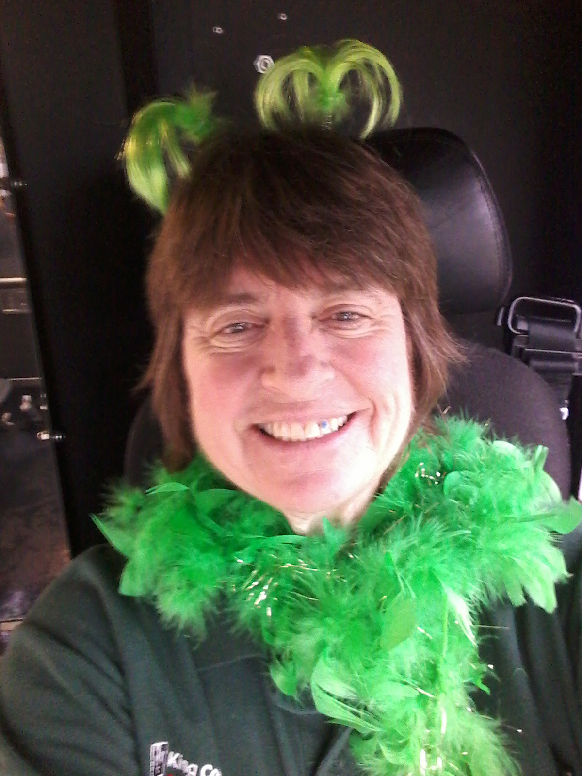 Bus operator Kathy Maddux in festive St. Patrick’s Day gear.