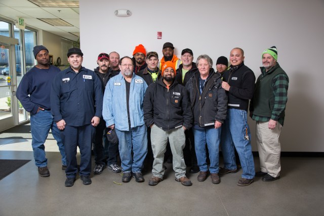 Diane with her coworkers from the Shelter Appearance day shift. Starting from left to right in consecutive order: Paul Jones, Jose Reyna, Andy Franco, Dan Thorn, Thomas Pickett, Micah Roberson, Mark Berry, Andre Boudy (in back), Oscar Freeman (in front), Mitch Carlson, Diane Gimenez, Scott Fuller, Ryan Abin and Ron MacMillan.