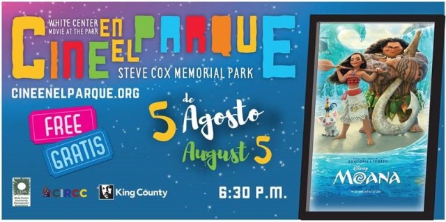 Employees are invited to participate in King County’s Cine en el Parque, Movie at the Park event on Saturday, Aug. 5 at Steve Cox Memorial Park in White Center, for the screening of Moana in Spanish with English subtitles.