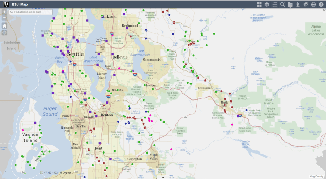 King County employees can access the ESJ iMap tool here. For more information about the ESJ iMap project, contact Larry Jones at Larry.Jones@kingcounty.gov or Harkeerat Kang at Harkeerat.Kang@kingcounty.gov.