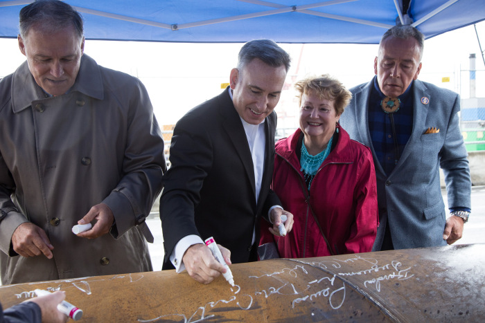 As crews continue to build King County Water Taxi’s future home, Executive Dow Constantine, Gov. Jay Inslee and other transportation leaders took time last week to celebrate the progress of the Seattle Multimodal Terminal at Colman Dock Project.