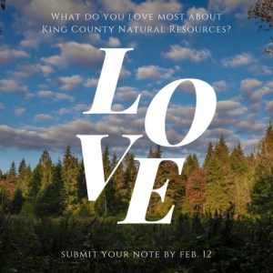 King County Department of Natural Resources and Parks wants to learn what you love and appreciate about our region’s natural resources. We want to see your love notes to and about your favorite trail, hike, lake, river, natural area, scenic view or environmental action to take. Did you know that King County Parks has 200 parks, 215 miles of backcountry trails, 175 miles of regional trails, and 28,000 acres of open space to pay homage to?