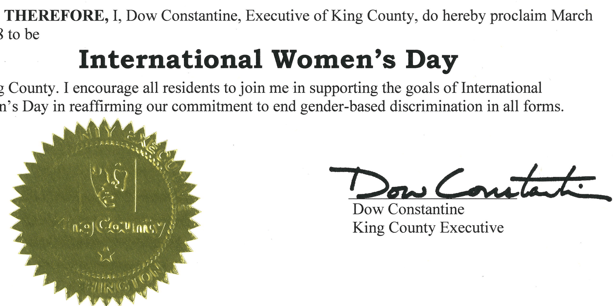 Today, March 8, is International Women’s Day, and King County Executive Dow Constantine has signed a Proclamation recognizing and celebrating the day.