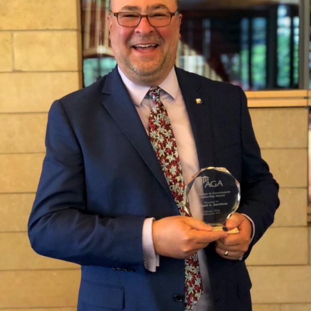 Michael Jacobson, Deputy Director of Performance, Strategy and Budget, has been recognized by the Association of Government Accountants with their 2018 Excellence in Government Leadership Award. This nationally recognized award is given to professionals who exemplify and promote excellence in government financial management, outstanding leadership, and innovative management procedures. It recognizes the cumulative achievements of state or local government professionals who have served as a role model and consistently exhibited the highest personal and professional standards.