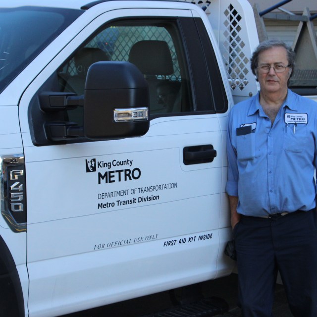 His day-to-day operations as an equipment painter for King County include painting the County’s buses and vehicles, equipment in the facility, and signs.