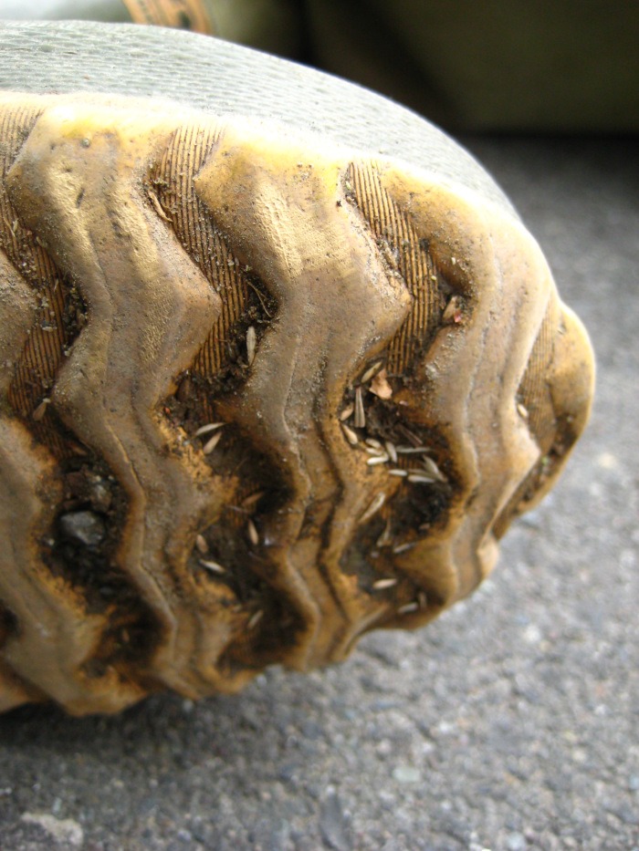 One of the main methods of weed dispersal is via seeds and other propagules that latch onto boots, pant legs, pet fur, tires, and other moving objects. Some, like the infamous garlic mustard (Alliaria petiolata), are really hard to see once they’re mixed in with mud and dirt. When you’re working around these plants, always use a boot brush to clean seeds and soil off of you, your pet, and your friends before leaving the site.