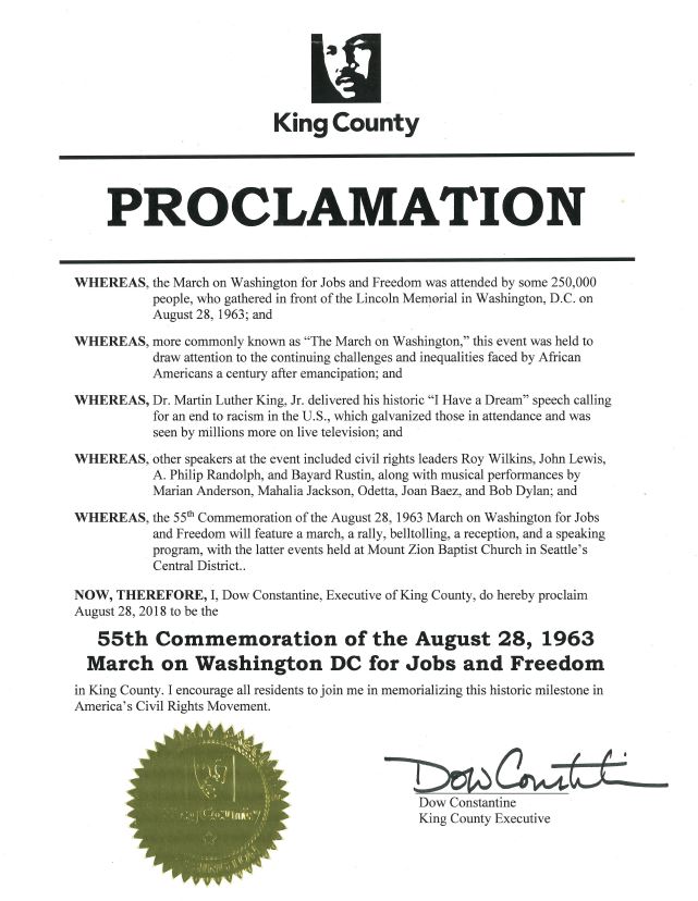 King County Executive Dow Constantine today issued a Proclamation marking the 55th Commemoration of the August 28, 1963 March on Washington DC for Jobs and Freedom.