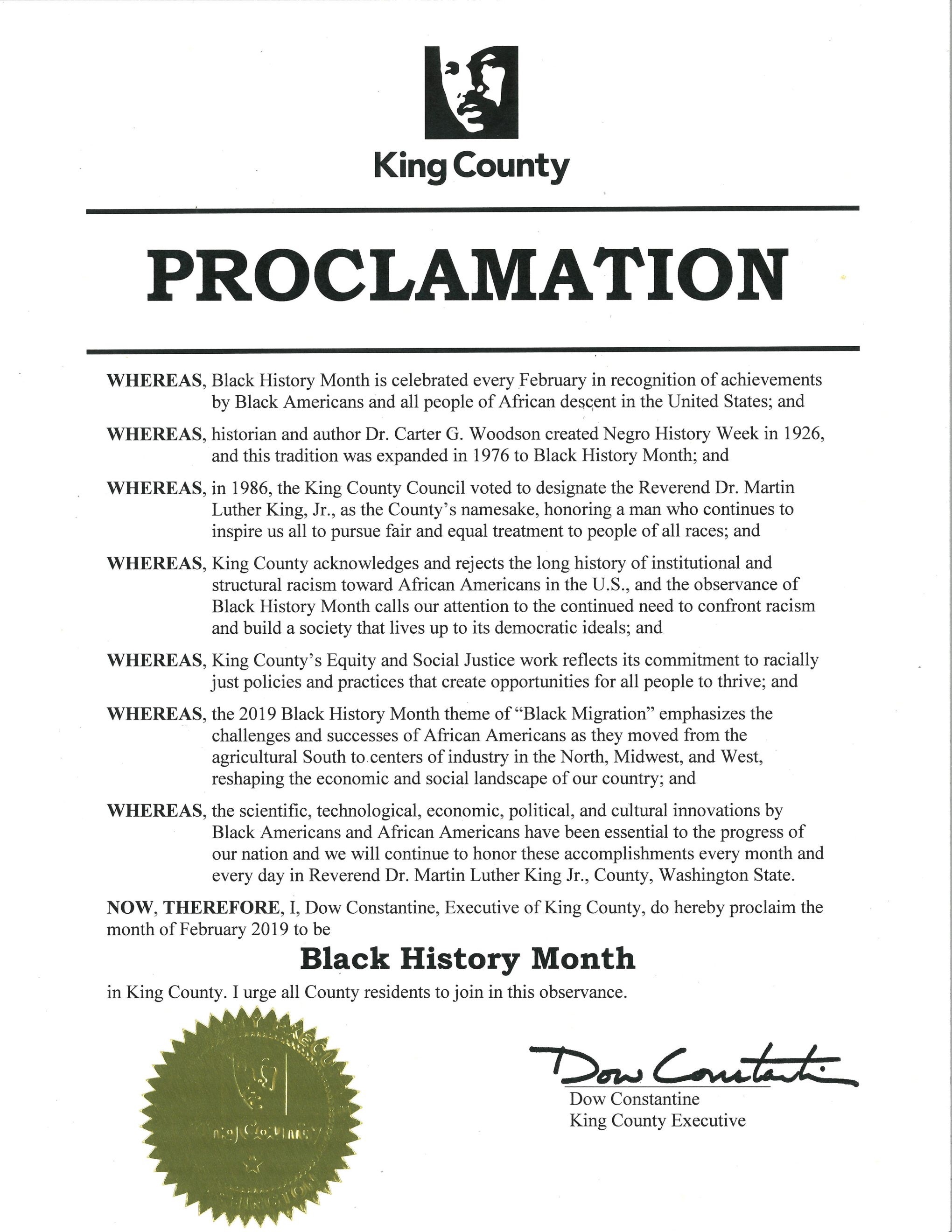 King County Executive Dow Constantine has proclaimed February 2019 to be Black History Month in King County.