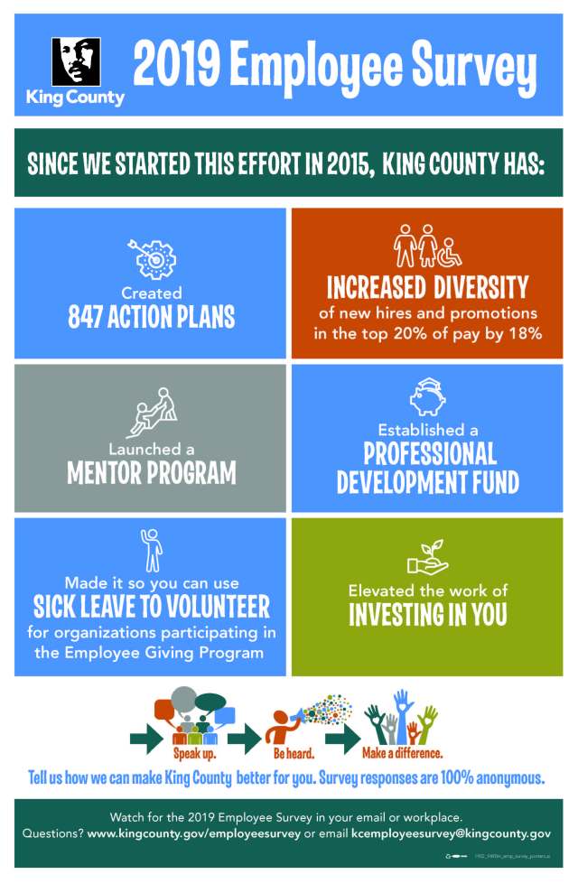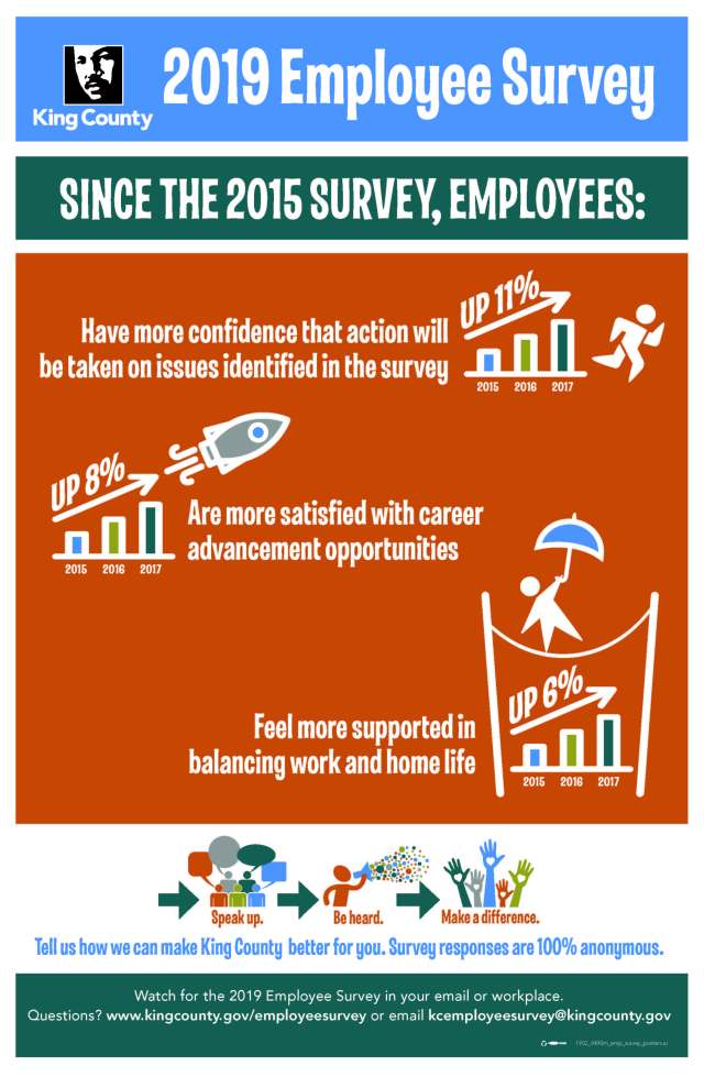 Employees who participated in the survey over the last three years have helped us make King County a better place to work, and a more effective service provider for our residents. This year we’re making some enhancements to make the survey work better for everyone: