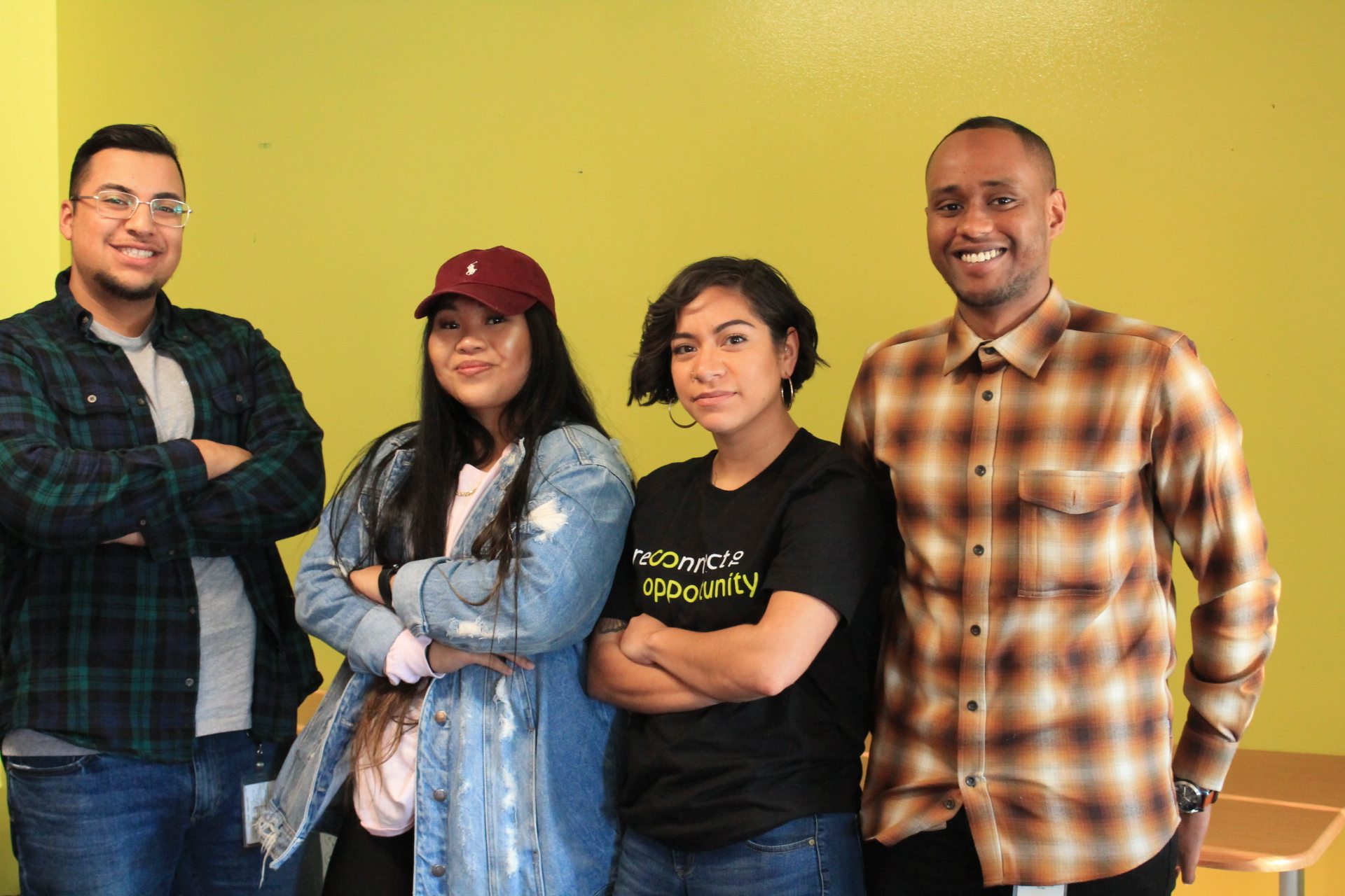 Pictured: Current King County Peer Connectors, whose role is to find disconnected youth in the community and support them in finding education or employment connections that are the best fit for them. From left to right, Omar Aldaco-Silva, Shannen Antolin, Maria Gonzalez, and Mohamed Ahmed.