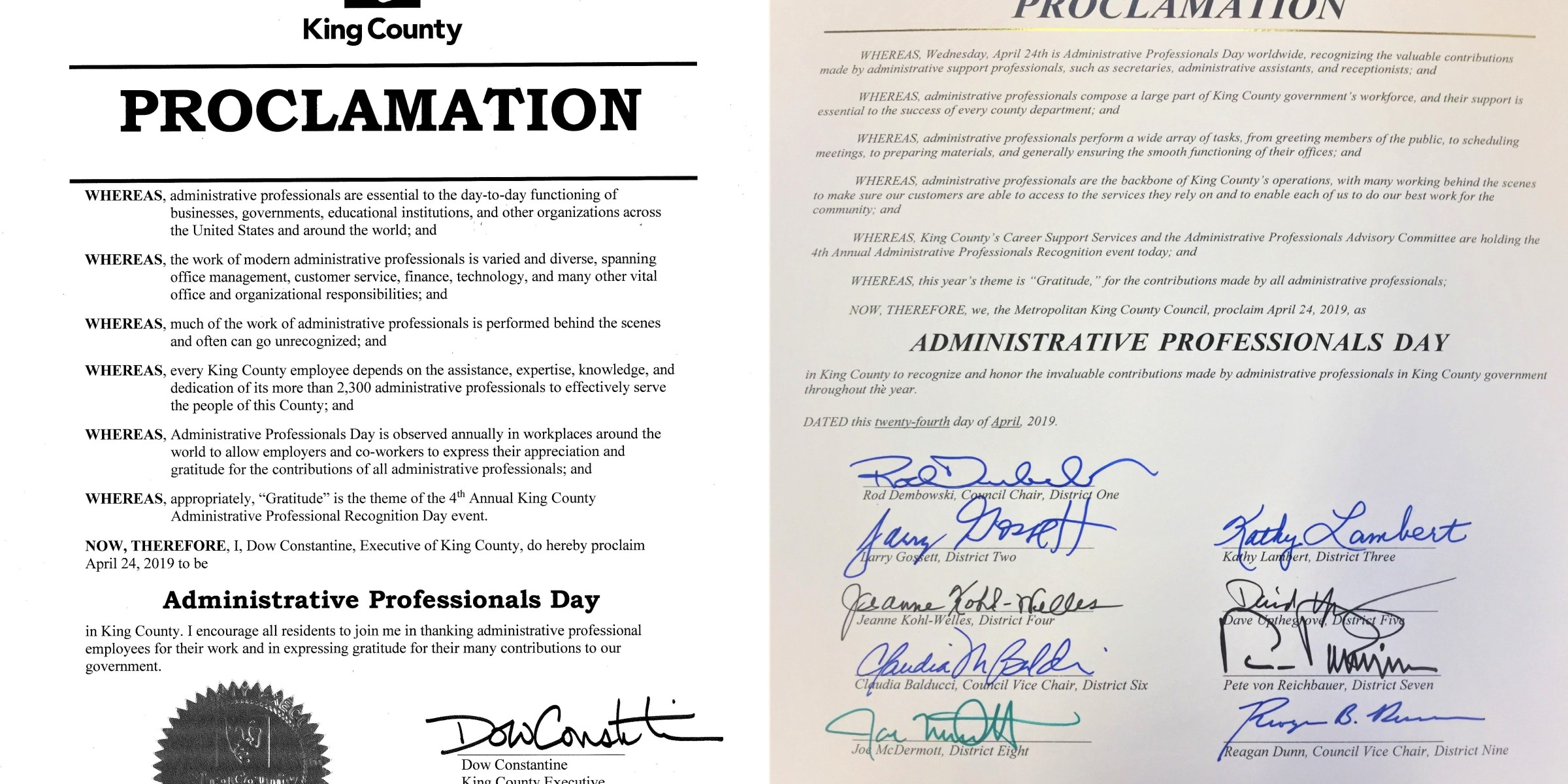 King County Executive Dow Constantine and the King County Council both proclaimed today, Wednesday, April 24, 2019, as Administrative Professionals Day in King County. Administrative Professionals Day is observed annually on the fourth Wednesday in April to recognize the many contributions of administrative professional employees.