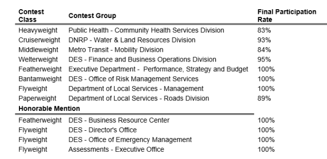 I will award each of the winners a trophy at a May 21 event to review the survey results, the same day that Executive Constantine will share the results with you. We will then start action planning to make sure we are acting on what you tell us in the survey.