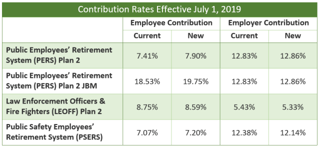 Employee and employer contribution rates for the following retirement plans changed on July 1, 2019, as approved by the State Legislature.