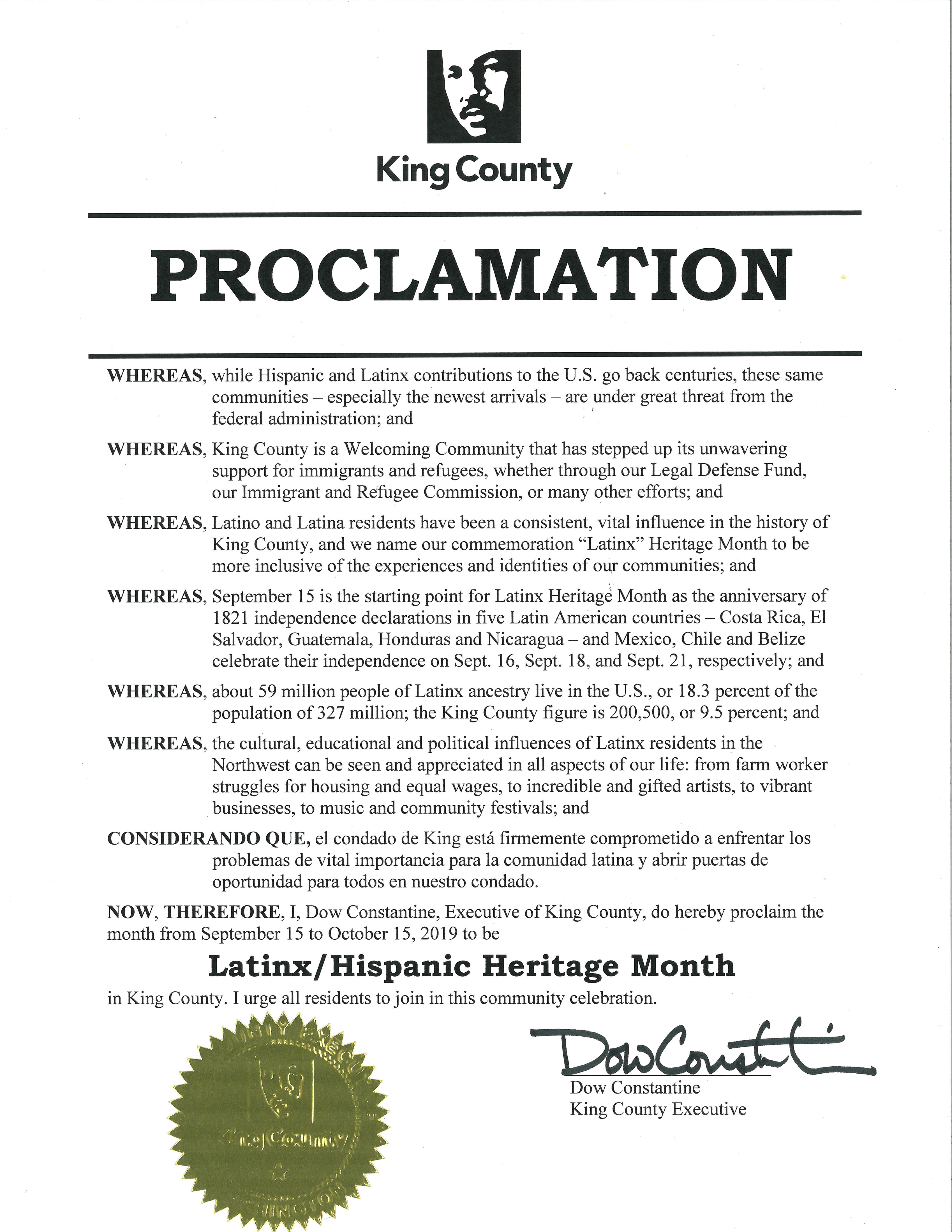 “Latino and Latina residents have been a consistent, vital influence in the history of King County, and we name our commemoration “Latinx” Heritage Month to be more inclusive of the experiences and identities of our communities,” Executive Constantine said in the Proclamation.