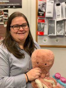 She loves her team and the work. “Just this week,” she told me, “a DV victim we helped years ago came back to the office with a huge bag of stuffed animals for kids. This is an annual trip. She appreciated the work we did for her and the work we will do tomorrow for the next family.” (The photo below is Colleen holding one of those stuffed animals.)