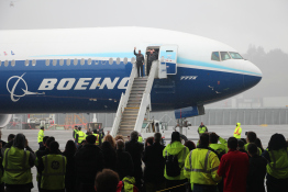 In a long-anticipated trip delayed two days by windy weather, Boeing’s new 777X took its first flight on Saturday, Jan. 25 from Paine Field in Everett. It landed about four hours later at King County International Airport (KCIA), after flight testing over Eastern Washington and a flight-to-flight photo session over Mount Rainier. The jet roared down the runway, leaving a trail of spray from the rain as it ended its journey.