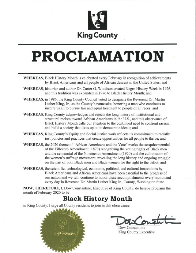 King County Executive Dow Constantine has proclaimed February 2020 to be Black History Month in King County. “Whereas. the scientific, technological, economic, political, and cultural innovations by Black Americans and African Americans have been essential to the progress of our nation and we will continue to honor these accomplishments every month and every day in Reverend Dr. Martin Luther King Jr., County, Washington State,” Executive Constantine said in his Proclamation.