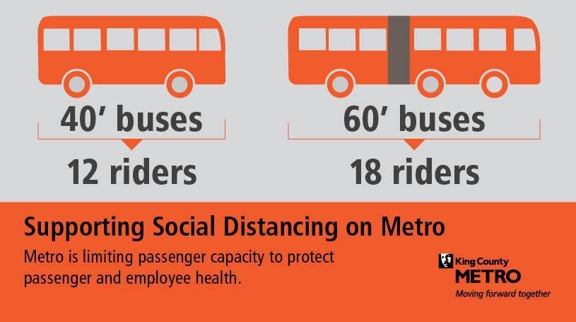 To better help each person maintain six feet of separation from others as guided by Public Health – Seattle & King County, the optimal number of passengers is 12 on a 40-foot bus and 18 on a 60-foot bus.
