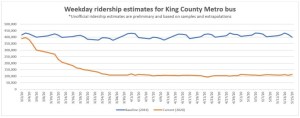 Ridership on King County Metro continues to remain steady at just over 100,000 daily trips across our reduced service network. We’re in the first week of a new directive to wear masks or face coverings in King County and on public transportation, and by wearing a mask you are helping support and protect drivers and customers who are using Metro to make essential trips.