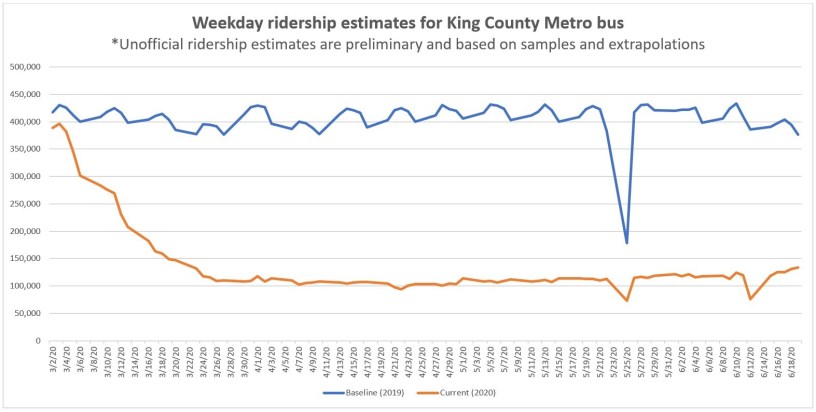 Ridership on King County Metro has increased in recent weeks as more people choose to ride public transportation and the state allows more activities under its “Safe Start” plan. Metro continues to require masks or face coverings be worn on transit. Buses currently have reduced passenger limits to support social distancing and limit the spread of COVID-19.