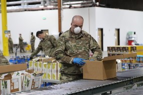 Pictured: A National Guard member helps pack food for distribution. About 330 National Guard members were deployed to help at food banks in King County. Of those, 116 ended their assignments by the end of June. That leaves a significant gap, since volunteers have for the most part followed the governor’s stay-home order.