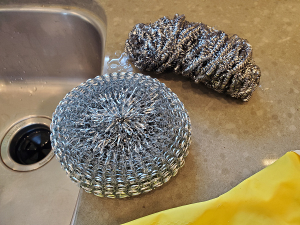 Pictured: People should use sink drain baskets to catch any metal strands that may break off scrub pads like these. Broken metal strands that go down the drain may damage wastewater treatment plant equipment.