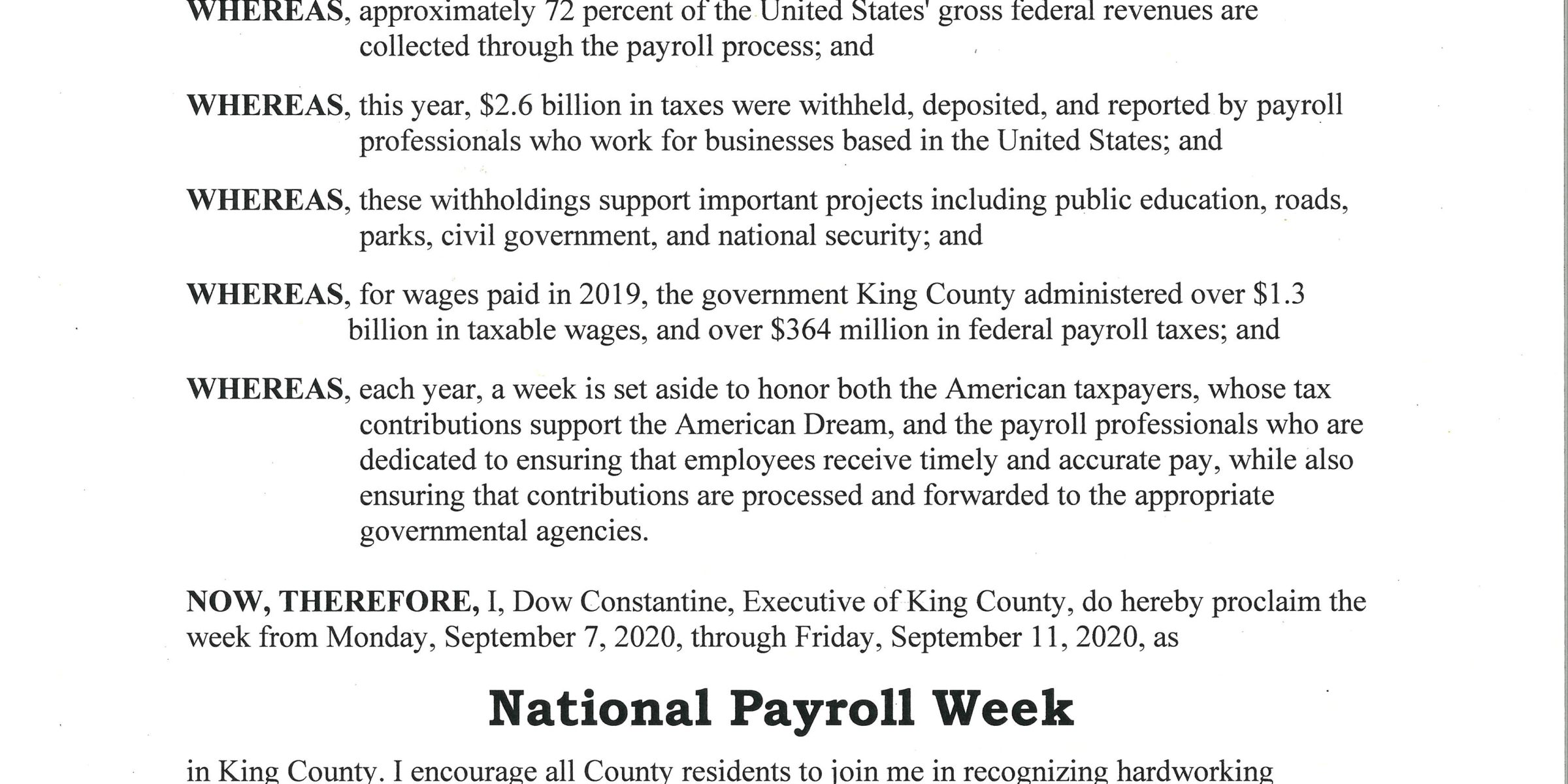 To show the appreciation of the county, King County Executive Dow Constantine has declared this week to be National Payroll Week 2020 in King County. View the official proclamation here.