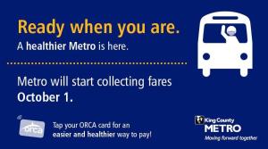 On Thursday, October 1, Metro will resume collecting fares for all transit services: buses, Access paratransit, Seattle Streetcar (First Hill and South Lake Union), Vanpool, Via to Transit and other flexible services, and water taxi (Vashon Island and West Seattle). Fare collection is already taking place on Sound Transit Express bus and Sound Transit light rail.