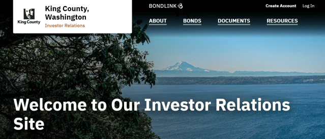King County’s first-ever Investor Relations website is now live. The site, maintained by a third-party vendor, BondLink, greatly improves the potential investor experience with links in one place to Official Statements, ratings, budgets, Comprehensive Annual Financial Reports (CAFRs), policies and more.