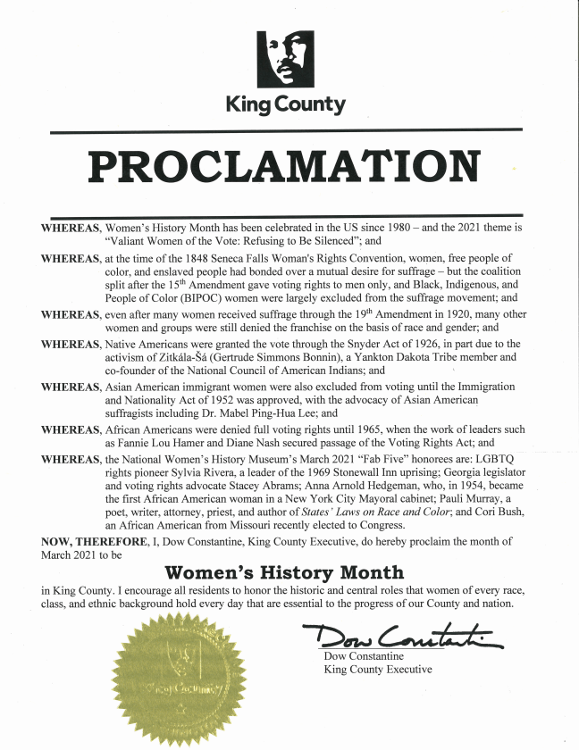 In recognition of the 41st year of Women’s History Month, King County Executive Dow Constantine has proclaimed March 2021 to be Women’s History Month. The proclamation states “Whereas Women’s History Month has been celebrated in the U.S. since 1980 – and the 2021 theme is “Valiant Women of the Vote: Refusing to Be Silenced” and “even after many women received suffrage through the 19th Amendment in 1920, many other women and groups were still denied the franchise on the basis of race and gender,” Executive Constantine encourages all King County residents to honor the “historic and central roles that women of every race, class, and ethnic background hold every day that are essential to the progress of our County and nation.”