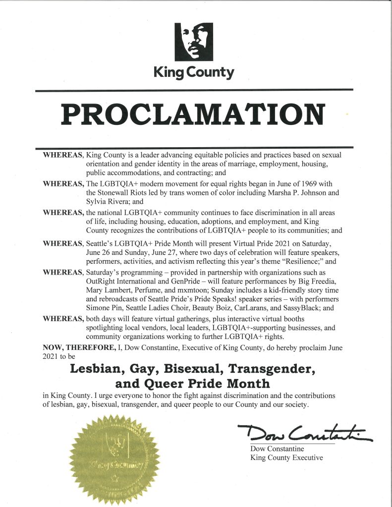 In recognition and support of the LGBTQIA+ community, King County Executive Dow Constantine has proclaimed June as Lesbian, Gay, Bisexual, Transgender and Queer Pride Month. King County is a leader in advancing equitable policies and practices based on sexual orientation and gender identity, and Executive Constantine urges “everyone to honor the fight against discrimination and the contributions of lesbian, gay, bisexual, transgender, and queer people to our County and our society.”