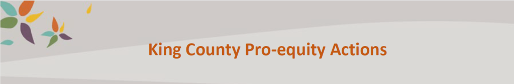 You, as an employee may have different (and better) approaches; but here are some first steps about how you can incorporate the four pro-equity actions in your work at the County. For each approach ask “how will I advance this pro-equity action with the urgency needed to help address the public health crisis which is racism?” If we do these things every day, individually and collectively, WE WILL make a difference and WE WILL reach our True North of “Making King County a welcoming community where every person can thrive.”