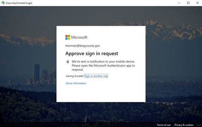 What does this mean for you? Each time you connect to VPN you must provide your username (username@kingcounty.gov) and password, and verify your identity on a separate device such as a cell phone or digital fob – just like when you access your Microsoft account. For employees currently enrolled in MFA, no additional action is necessary. Simply respond to the MFA security requests on your enrolled device, as described below.