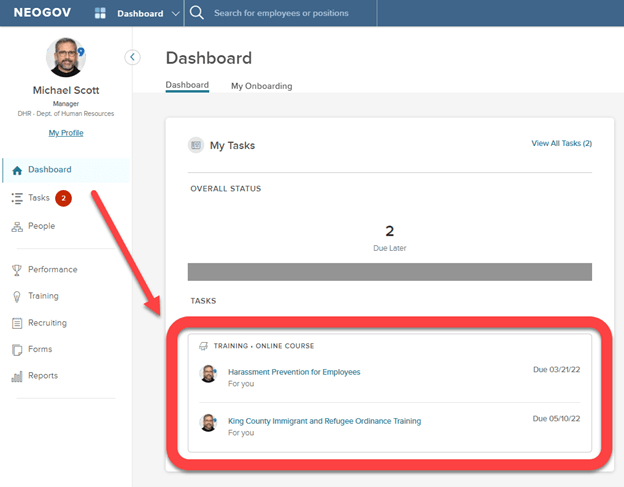 To find both the Harassment Prevention for Employees and Immigrant and Refugee Ordinance trainings, go to your KC eLearning NEOGOV Learn dashboard. To see your completed trainings, click on Training and then View Course Transcript (see below):