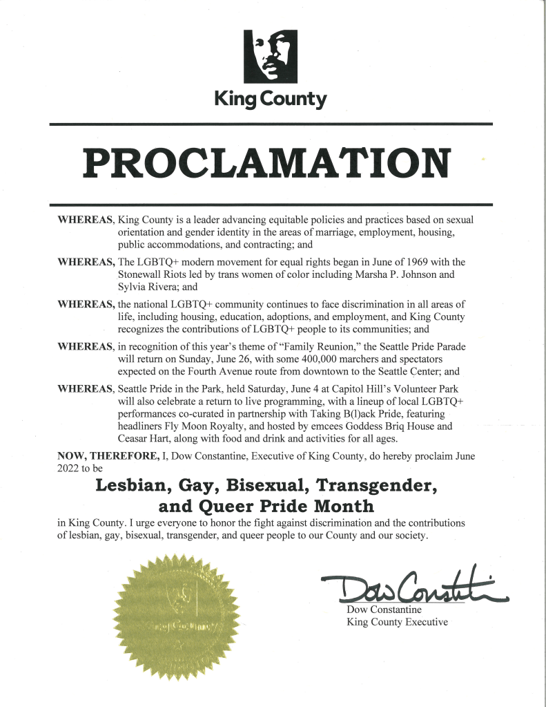 King County Executive Dow Constantine has proclaimed June 2022 as Lesbian, Gay, Bisexual, Transgender, and Queer Pride Month. King County is a leader advancing equitable policies and practices based on sexualorientation and gender identity in the areas of marriage, employment, housing, public accommodations, and contracting. Executive Constantine urges everyone to honor the fight against discrimination and the contributions of lesbian, gay, bisexual, transgender, and queer people to our County and our society. View the full proclamation below.