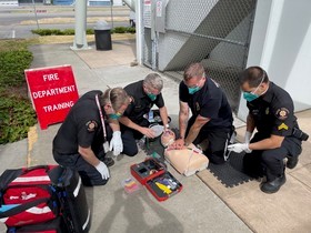 During the training scenario, ARFF deputies practiced radio procedures to summon mutual aid support, coordination with Airport Operations, and most important: high-quality CPR with an automated external defibrillator (AED).