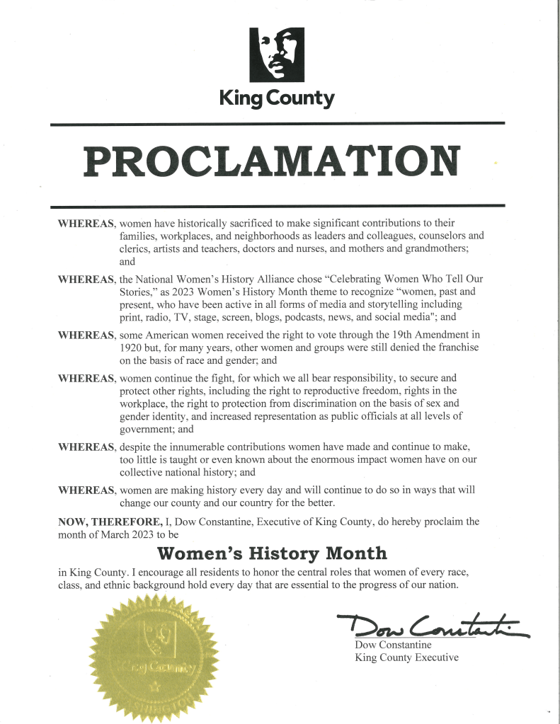 “Women are making history every day and will continue to do so in ways that will change our county and country,” the proclamation states. The Executive enccourages all King County residents to honor the central roles that women of every race, class, and ethnic background hold every day that are essential to the progress of our nation.