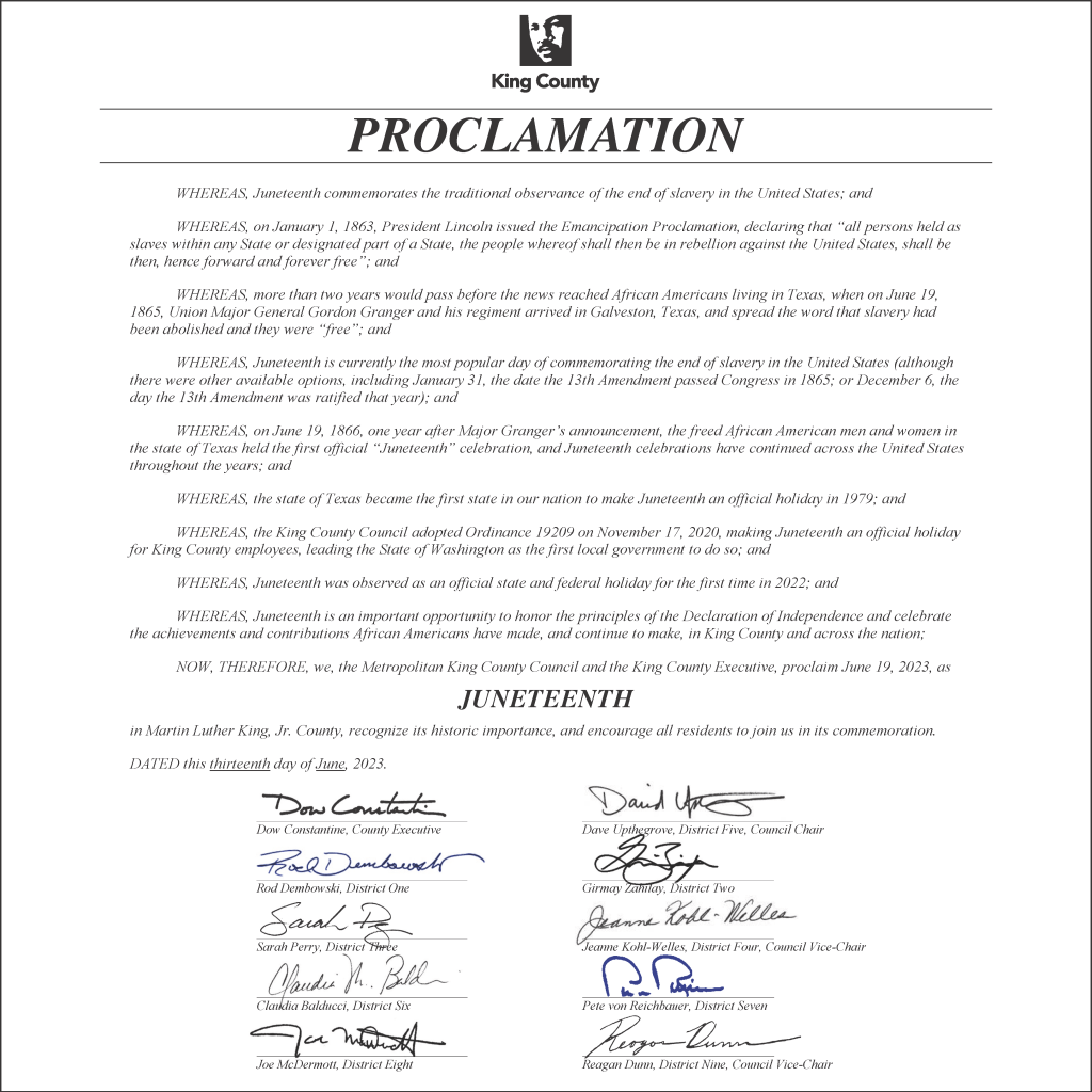 King County Executive and County Council proclaim June 19, 2023 as Juneteenth