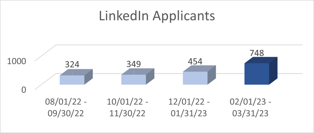 Recruiters are using social media blocks developed by the team to increase our outreach and marketing using a visual image/story as part of job postings on LinkedIn. The team has built over 180 unique images for recruiters to choose from along with creating a user guide on how to post jobs (you can even set them up in advance to launch on a specific date). To assess the effectiveness of this program, the team developed an eight-week contest where 30 recruiters opted to participate by posting on LinkedIn with the tools and we saw dramatic results. The contest resulted in an over 130% increase of applicants with 748 identifying LinkedIn as their source for finding and applying for a job at King County.