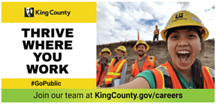 We know that best practice in recruiting using social media is to include personal stories and to use images to attract the viewers to stay longer. Check in with your department’s HR to learn more about their recruitment efforts. We encourage you to include #IworkforKingCounty and #GoPublic, and to add a personal note where you can when posting. Thanks for living the “We are one team” value!