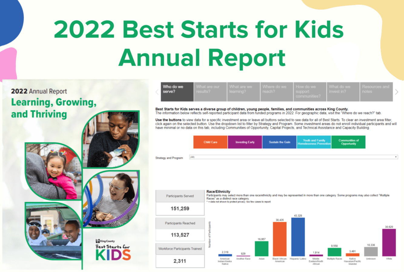 In 2022, Best Starts for Kids expanded into new investment areas, responding to community input and need, including funding equitable access to high quality, affordable, and well-compensated child care. Best Starts launched an equity-centered capital program to build, repair, and expand community spaces to better serve communities. Best Starts extended contracts to support continuity of services, offered 34 funding opportunities, and distributed over $110 million to community partners. Best Starts partnered with more than 450 community-based organizations operating more than 500 programs to reach over 264,000 children, young people, families, and community members across King County. Read more.