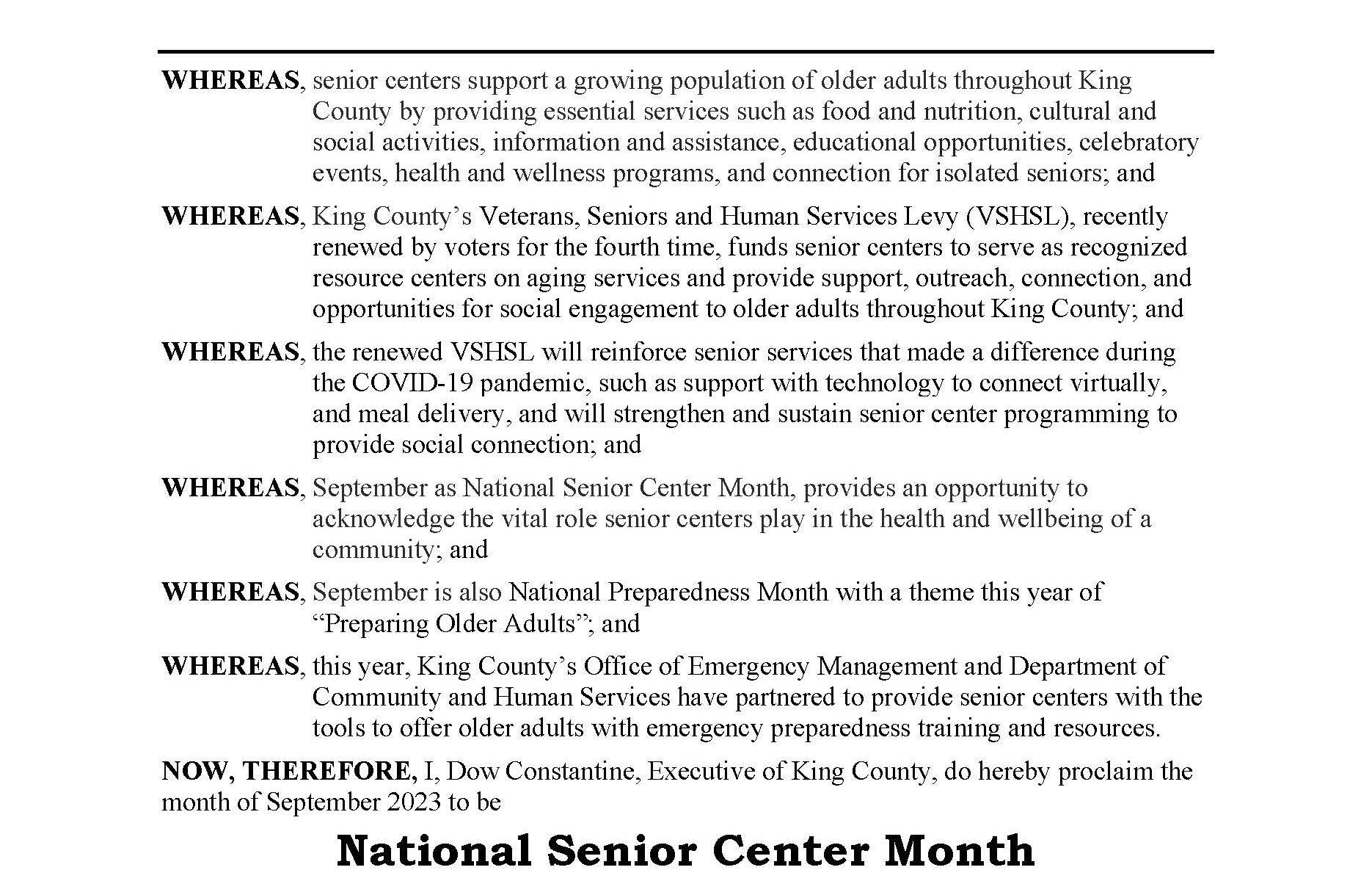 Please join the Department of Community and Human Services and King County Executive Dow Constantine in celebrating National Senior Center Month by visiting the senior center in your community. View the official proclamation here.